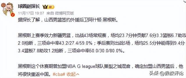 值得一提的是根据此前媒体人赵探长报道,黑根斯上赛季效力新疆男篮,出战43场常规赛,场均23.7分钟贡献7.6分3.3篮板6.7助攻2.0抢断,三项命中率43.2/27.4/59.0%;季后赛则出战5场,场均25.5分钟能得到9.4分3.4篮板7.8助攻1.2抢断,三项命中率50.0/30.0/80.0%。