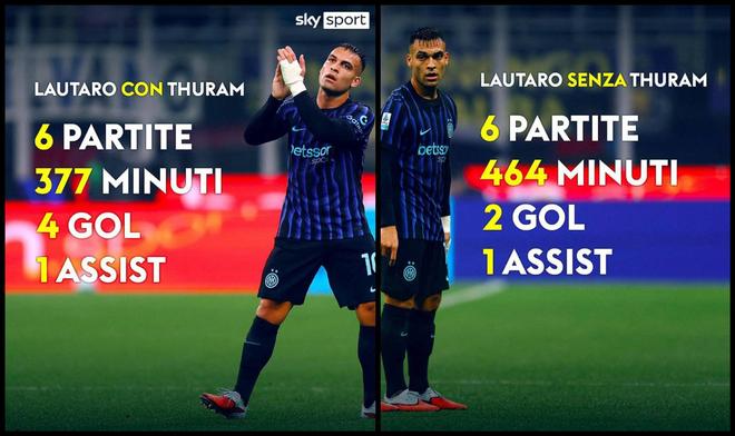 根据天空体育统计,劳塔罗与小图拉姆搭档出战6场377分钟,这期间他有4球1助入账;在没有小图拉姆期间,劳塔罗与另外两名前锋搭档出战6场464分钟,却只有2球1助入账,得分效率差距明显。