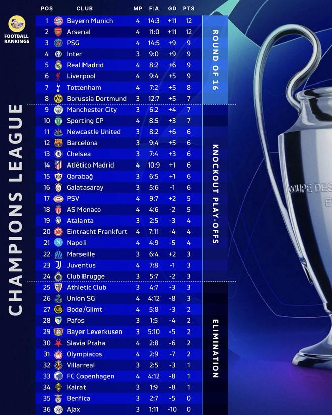 今天凌晨,欧冠联赛阶段第4轮开打。此前保持全胜的球队中,拜仁客场2:1击败卫冕冠军巴黎,皇马则是客场0:1不敌利物浦,阿森纳3:0轻取弱旅布拉格斯拉维亚。这样的话,就只剩拜仁和阿森纳4轮全胜排在积分榜前两位。