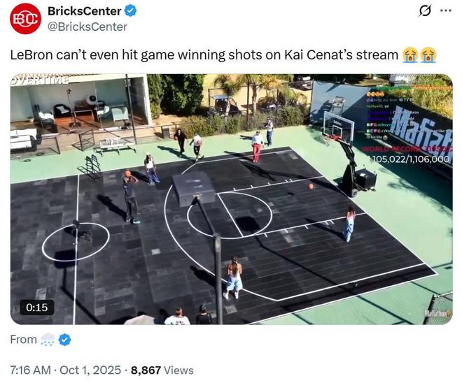 除了发表演讲之外,詹姆斯还现身球场参与了户外投篮,他要求好友Kai Cenat模仿比赛关键时刻3、2、1的紧张解说氛围,结果三分三投连续不中。