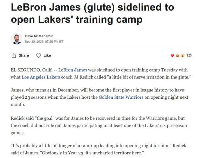 主帅雷迪克在训练结束后透露了这一消息,表示詹姆斯臀部还有一点神经刺激的问题,因此缺席了训练营第一天的训练。