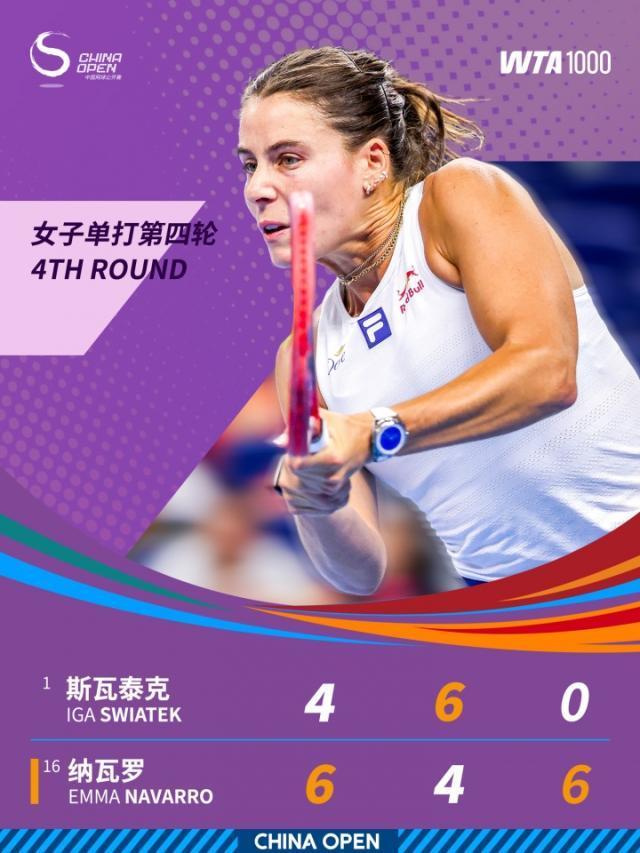 中网女单第四轮,16号种子纳瓦罗决胜盘送蛋,以6比4、4比6、6比0挑落头号种子、前赛会冠军斯瓦泰克,职业生涯第三次击败世界前二,这也是她第三次跻身1000赛八强。
