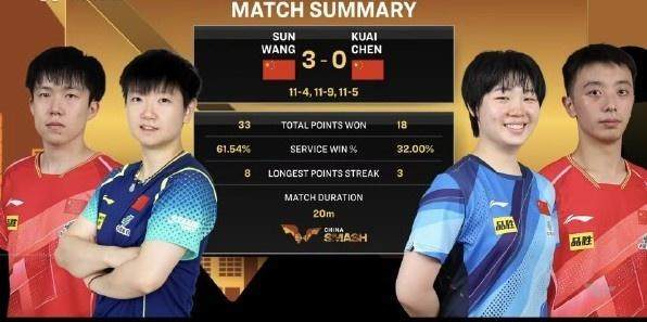 2025年WTT中国大满贯混双1/4决赛,王楚钦/孙颖莎以3比0(11比4、11比9、11比5)战胜队友陈垣宇/蒯曼,晋级四强。王楚钦/孙颖莎半决赛的对手是巴西组合雨果/高桥·布鲁娜。